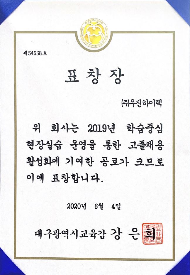 2019년 학습 중심 현장실습 운영을 통한 고졸채용 활성화 표창장